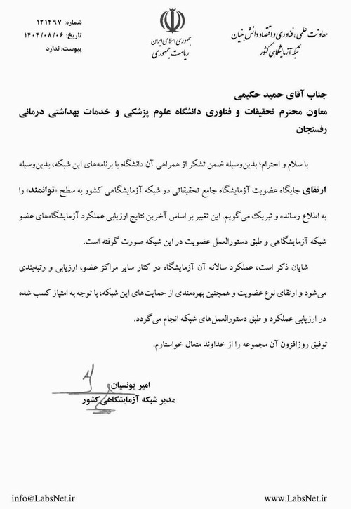 و همچنین موفق به کسب رتبه 3 بین آزمایشگاه های استان کرمان در ارزیابی شبکه آزمایشگاهی کشور شد.